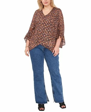 Vince Camuto updates a printed plus size blouse with flounce-cuff 3/4-length sleeves for a romantic touch.