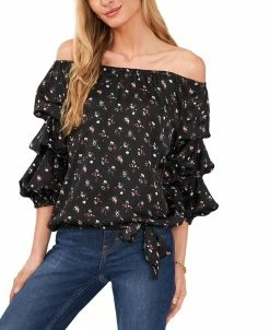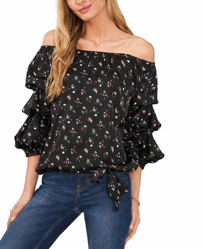 A sweet floral print brings vintage-inspired charm to this Vince Camuto top, an off-the-shoulder silhouette finished with bubble sleeves.