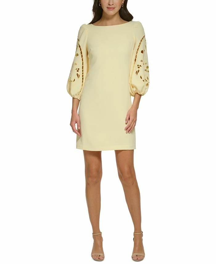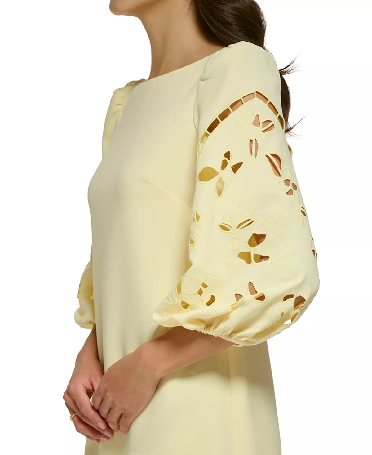 Embroidered cutout sleeves elegantly frame this solid shift dress from Vince Camuto.